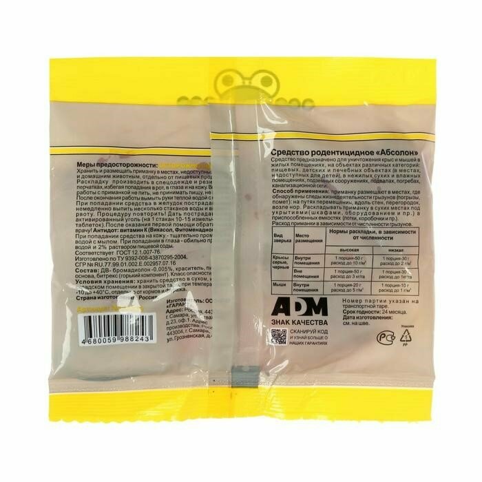| Способ применения | Приманку разместить в местах, где обнаружены следы жизнедеятельности грызунов |