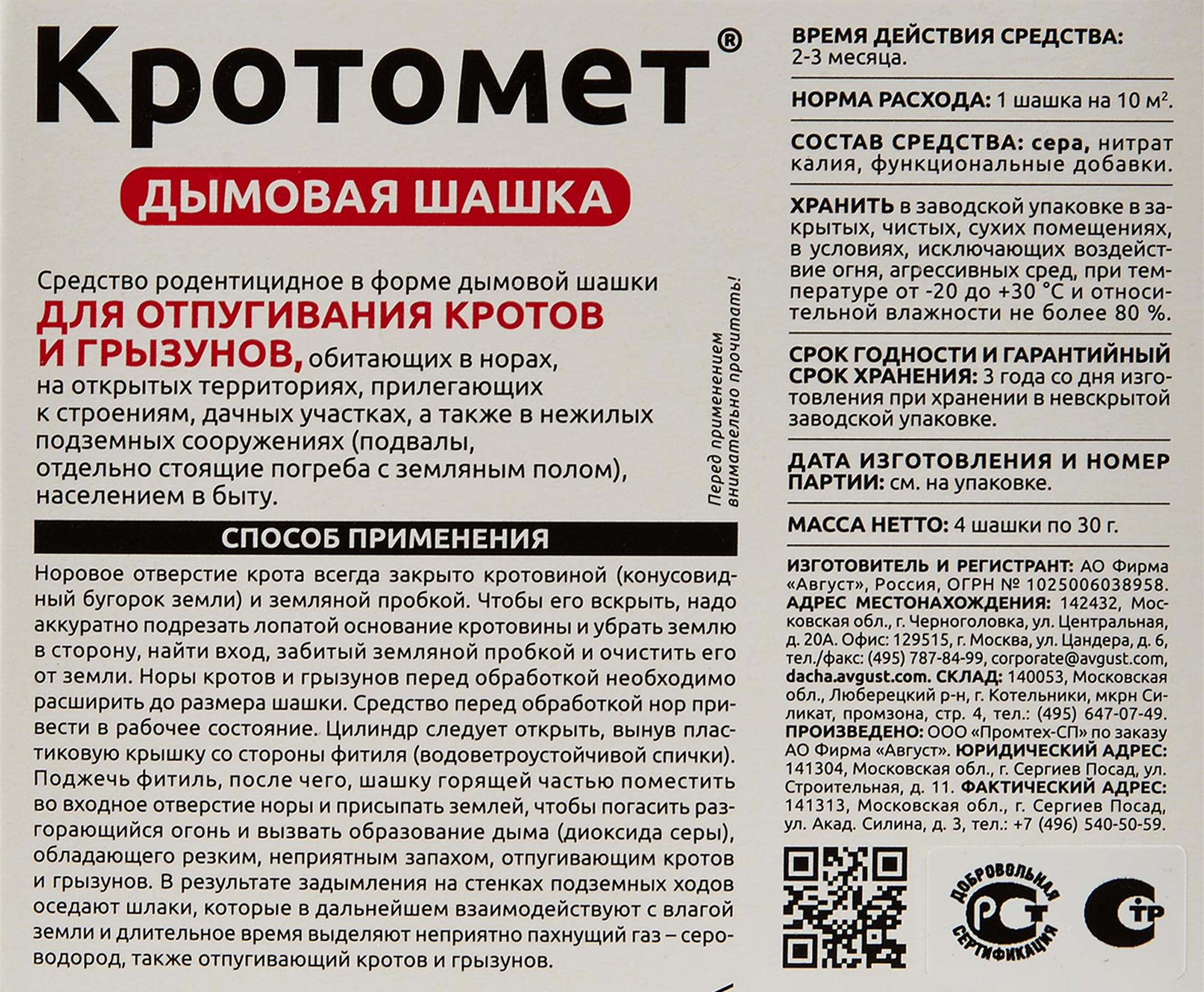| Способ применения | поместить Кротомет горящей частью во входное отверстие норы, присыпав землей, чтобы погасить разгорающийся огонь и вызвать образование дыма |
