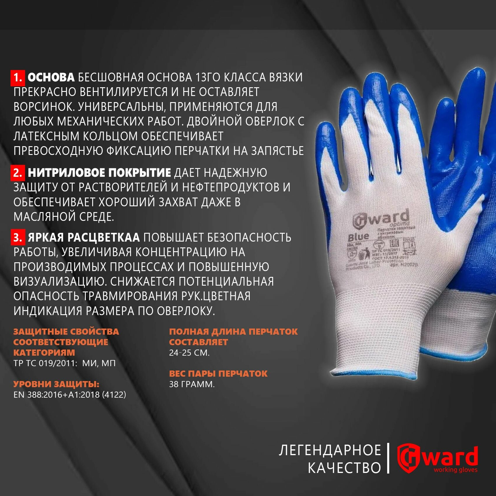 Перчатки нейлоновые с синим нитриловым покрытием, рабочие, хозяйственные Gward BLUE белого цвета, размер 10 (XL), 12 пар