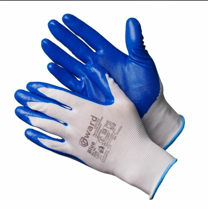 СохранитьПерчатки нейлоновые с синим нитриловым покрытием, рабочие, хозяйственные Gward BLUE белого цвета, размер 9 (L), 12 пар интересное: