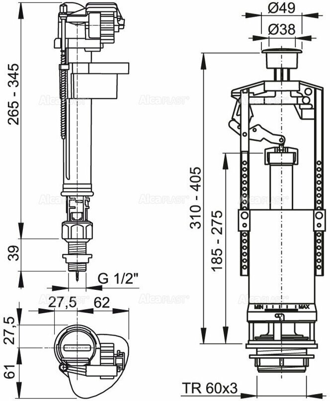 Арматура для унитаза Alcaplast SA2000SK нижняя подводка (металл), стоп кнопка