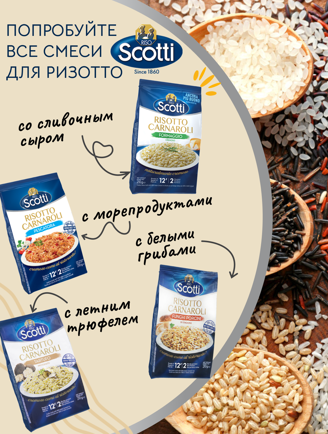 Рис белый Карнароли, Ризотто со сливочным сыром 4 шт, Riso Scotti Risotto Al Formaggio, 210 г., без глютена/Готовый гарнир, готовое итальянское блюдо