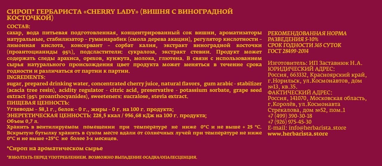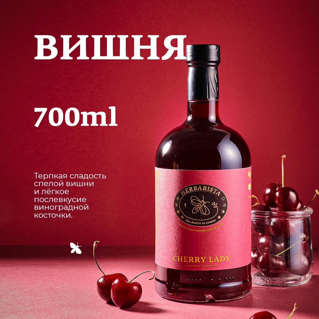 Сироп для кофе, коктейлей, десертов и выпечки Herbarista, Вишня с виноградной косточкой Cherry lady, 700 мл