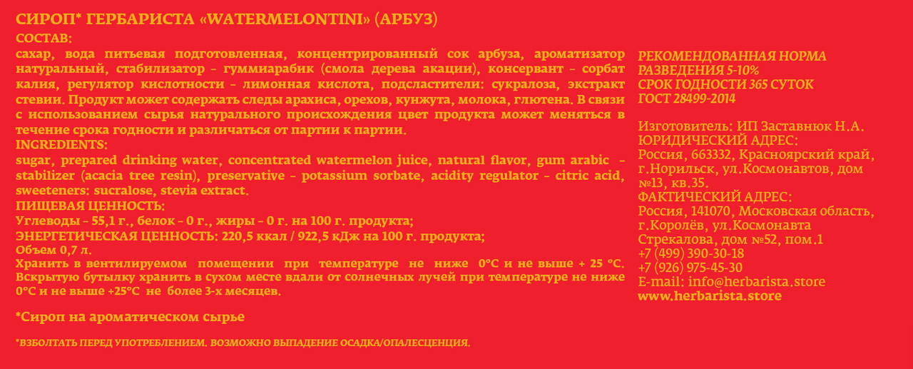 Купить Сироп для кофе, коктейлей, десертов и выпечки Herbarista, Арбуз Watermelontini, 700 мл