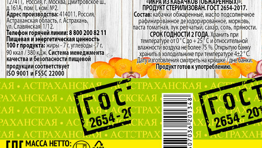 | Состав | кабачки обжаренные, лук репчатый, масло подсолнечное рафинированное дезодорированное, морковь, томатная паста, соль поваренная пищевая, сахар, пряности. |