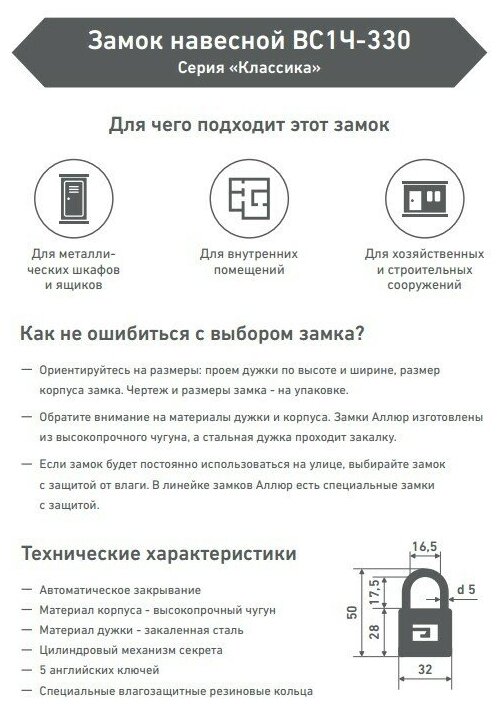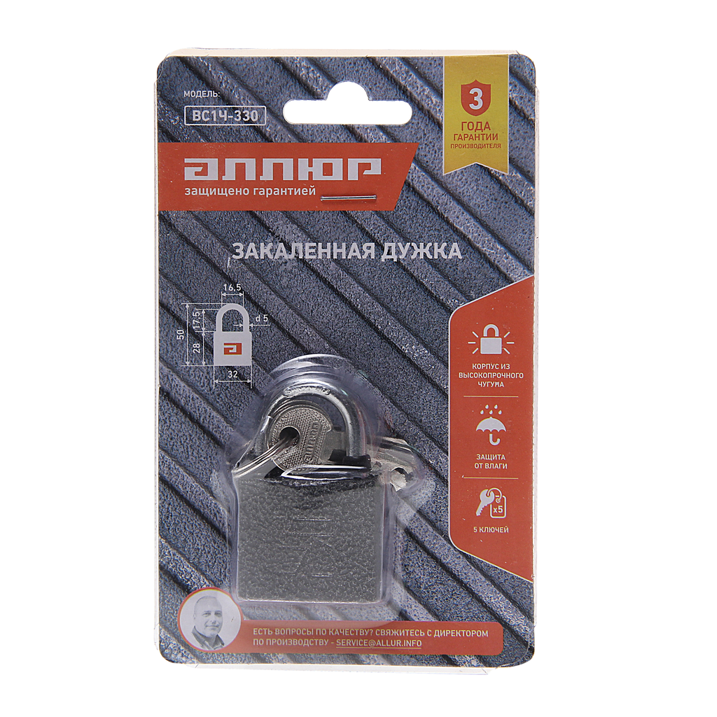 Замок навесной аллюр вс1ч-4505 d7мм 5 ключей