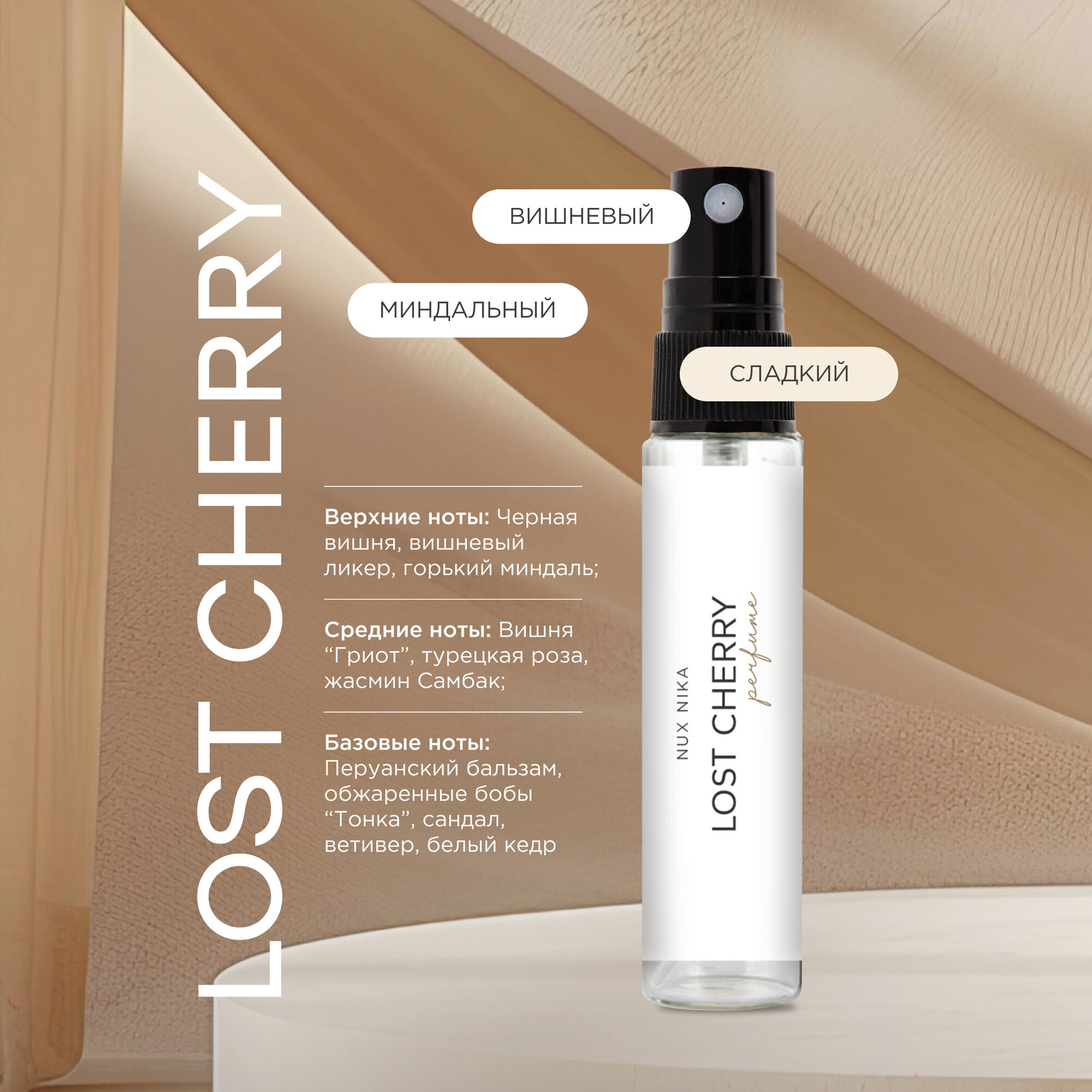 | Верхние ноты | Горький миндаль, шафран, маракуйя, персик, груша, малина, лист черной смородины, песок, горький миндаль, черная вишня, яблоко, цитрусы |