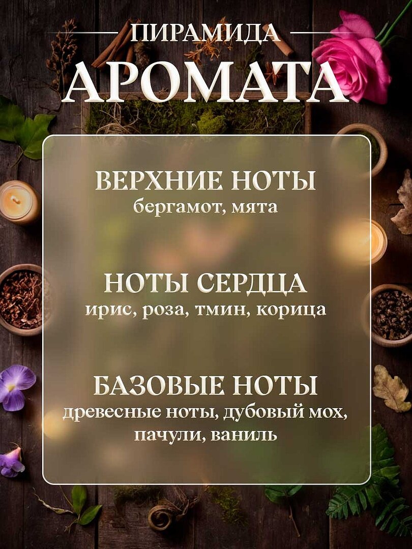 | Ноты | древесные ноты / дубовый мох / пачули / ваниль / ирис / роза / тмин / корица / бергамот / мята |