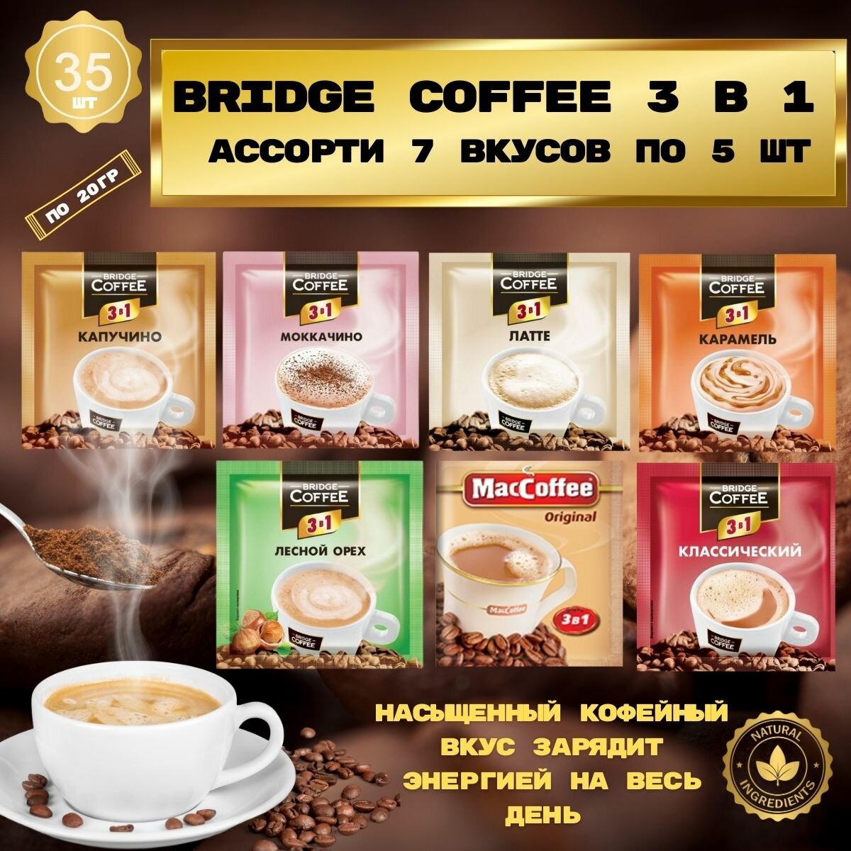 Купить Кофе 3 в 1 Bridge Coffee 7 вкусов по 5 (упаковка 35 шт) Капучино,Латте,С ароматом лесного,ореха,Карамель,Моккачино,Классический,MacCoffee The Original
