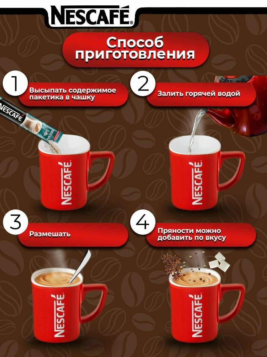 | Состав | cахар, глюкозный сироп, масло пальмоядровое, масло кокосовое, кофе натуральный растворимый NESCAFE, сухая молочная сыворотка, ароматизаторы, стабилизаторы (E340(ii), E331(iii), E452(i), E471, E471, E472e), обезжиренное сухое молоко, казeинат натрия (молочный), соль, агент антислеживающий (Е551) |