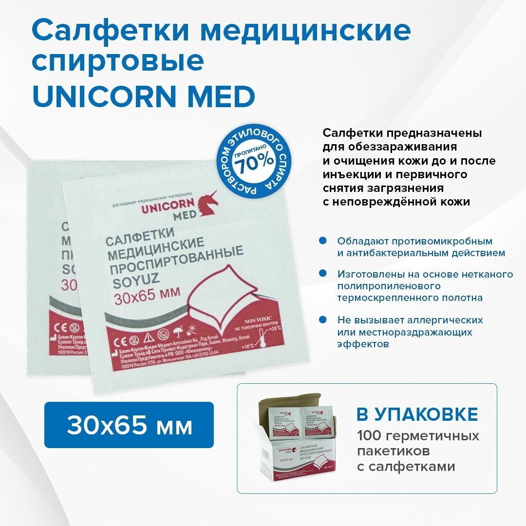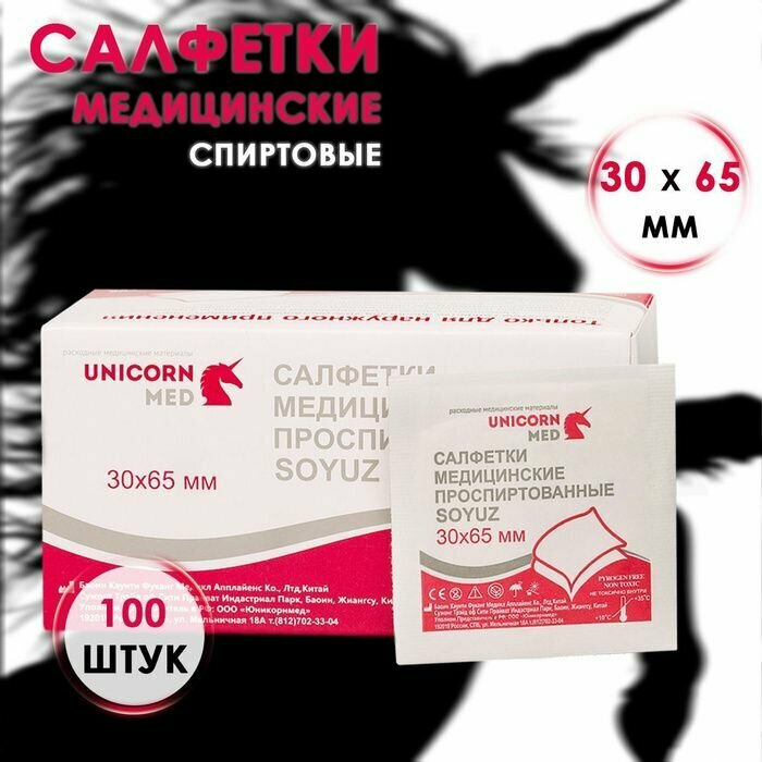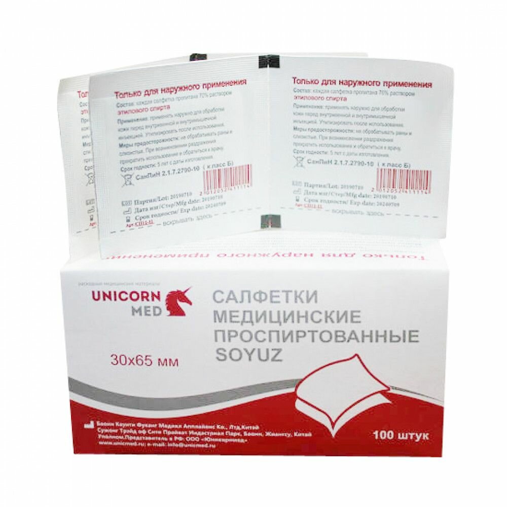Салфетки спиртовые медицинские 100x60 мм 100 шт "SOYUZ" UnicornMed Антисептические антибактериальные дезинфицирующие для инъекций
