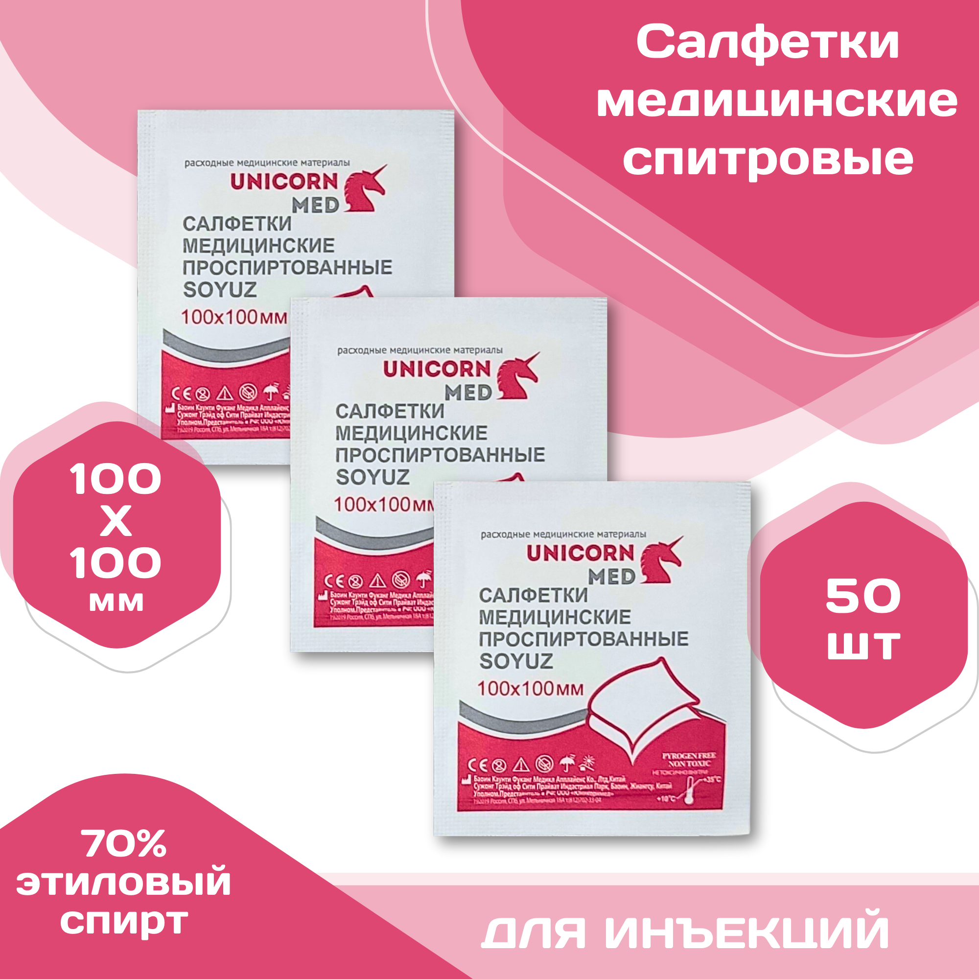 Спиртовые салфетки Unicorn Med SOYUZ, для инъекций, размер 110x125, 100 штук