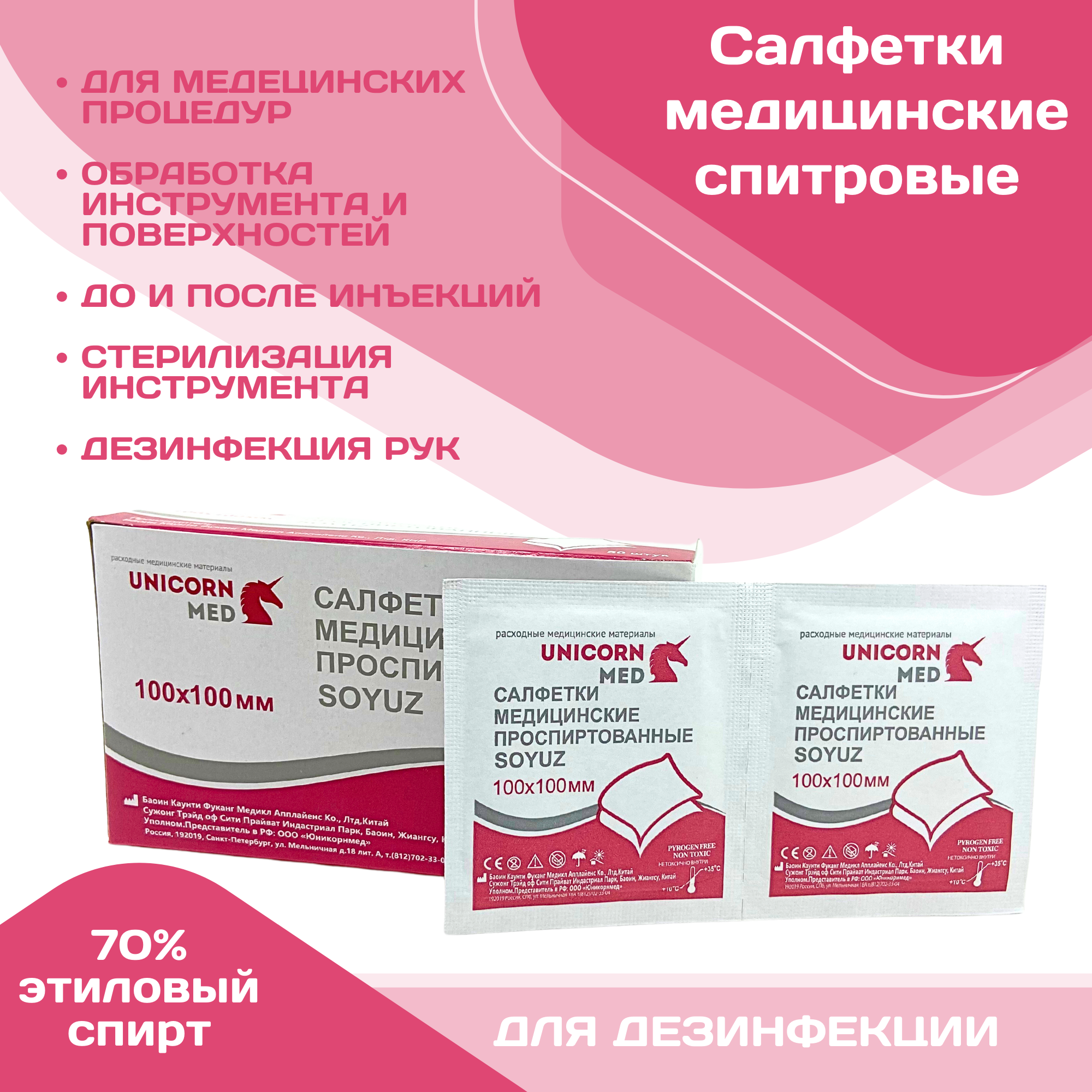 Салфетки спиртовые медицинские 100x60 мм 100 шт "SOYUZ" UnicornMed Антисептические антибактериальные дезинфицирующие для инъекций