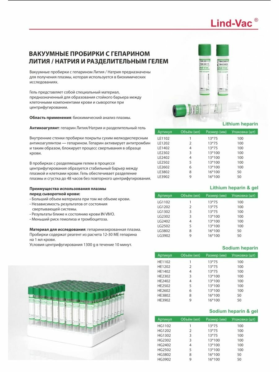 Вакуумные пробирки LIND-VAC с натрий гепарином и гелем 50 шт арт 3900