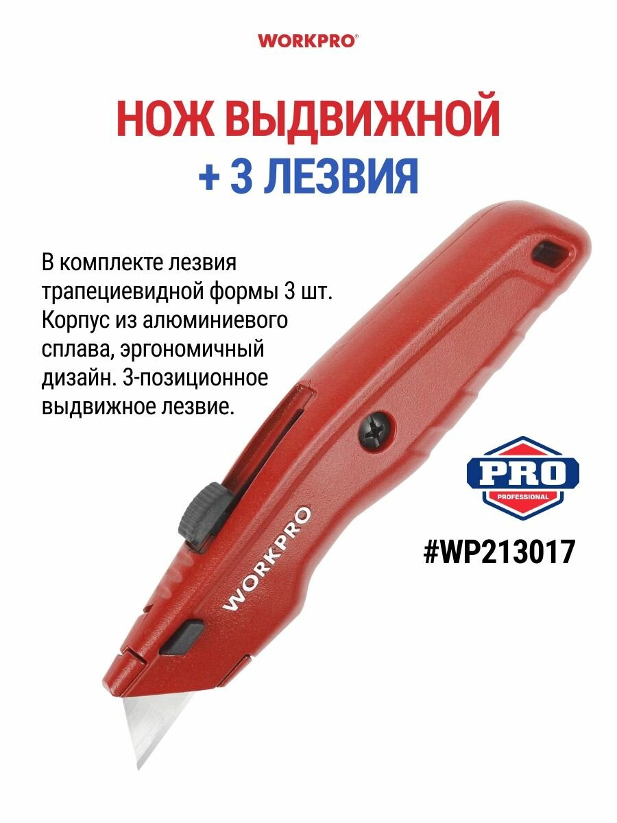 Нож строительный выдвижной универсальный + 3 лезвия WP213017, WORKPRO #WP213017