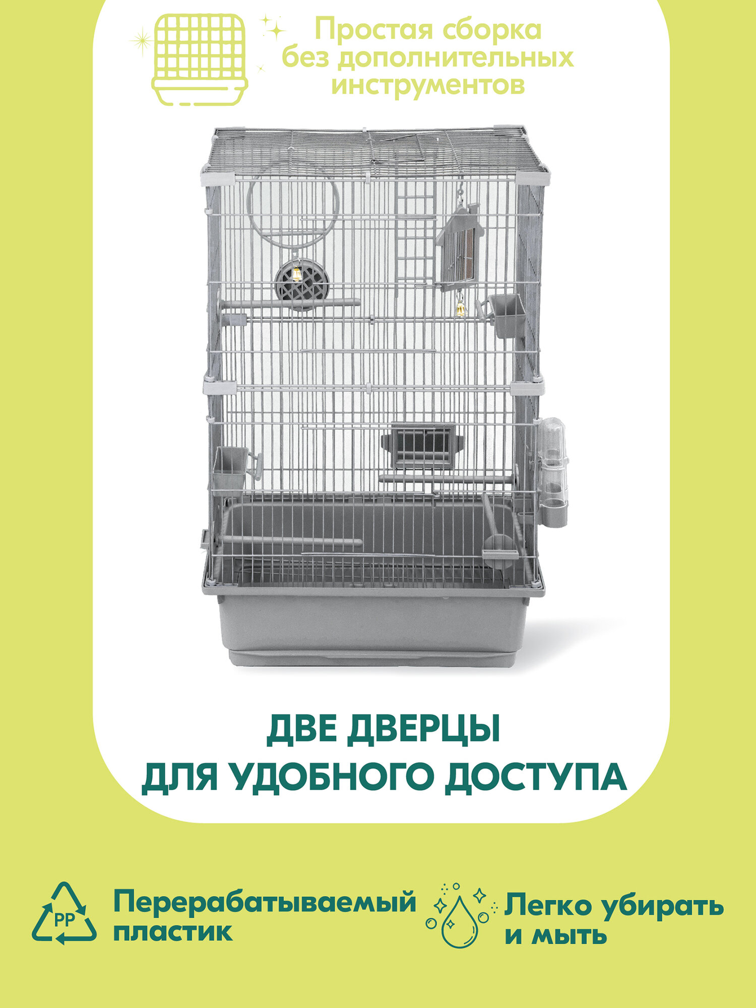 | В комплекте | жёрдочка / зеркальце / качели / кормушка / лесенка / поилка |