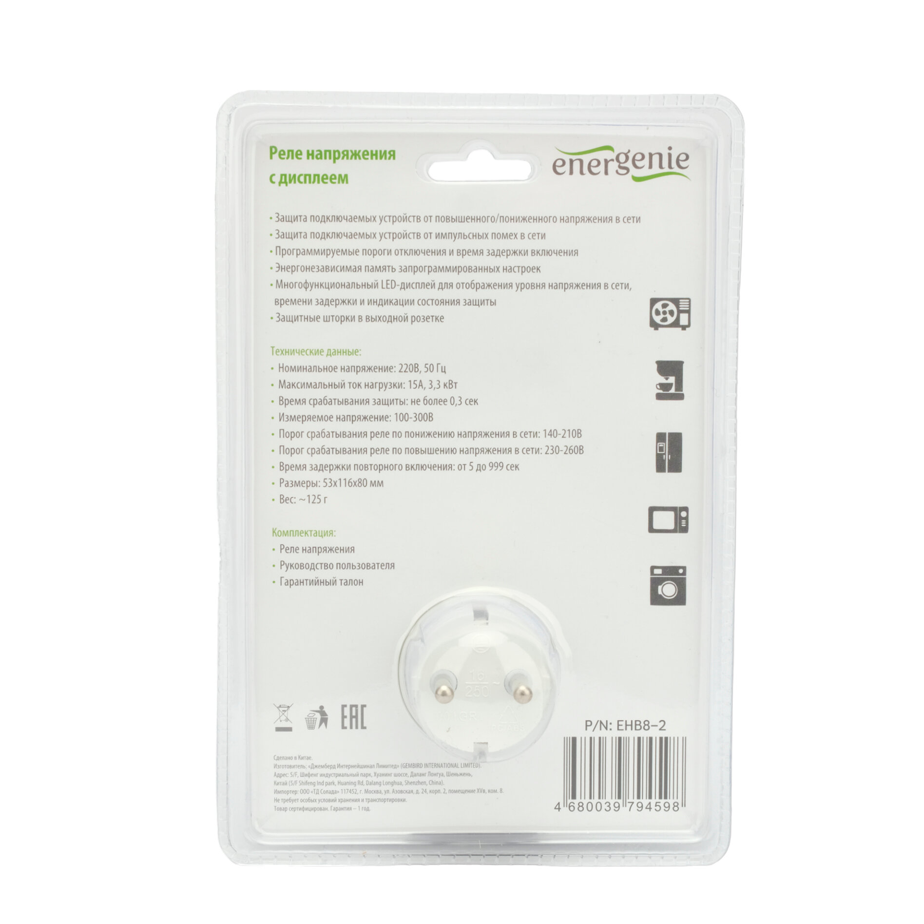 Купить Реле напряжения c дисплеем Energenie белое с защитными шторками и заземлением EHB8-2