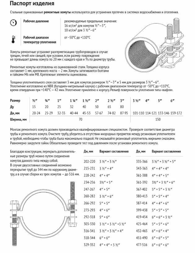 | Дополнительная информация | Ремонтные хомуты используются для устранения протечек в системах водоснабжения и отопления |
