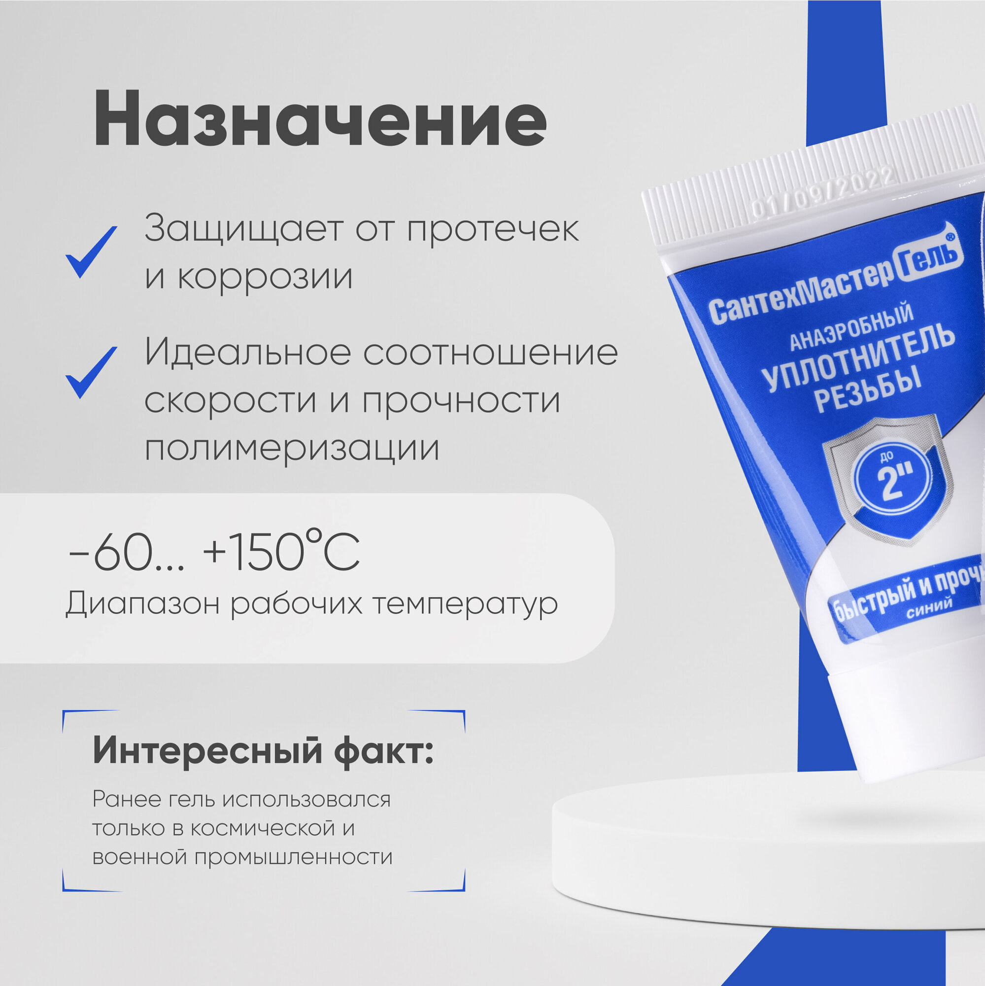 Анаэробный герметик "Сантехмастер Гель" Синий, тюбик 60 г, с еврослотом, прочный и разборный