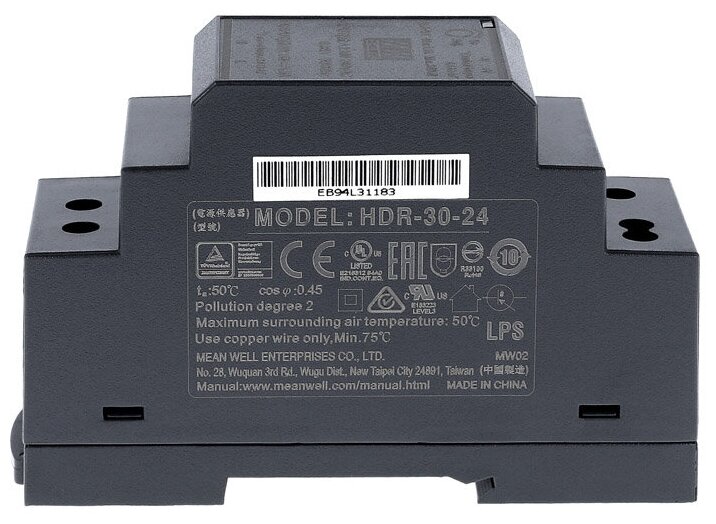 Блок питания MEAN WELL HDR-30-24, Блок питания импульсный, 36Вт, 24ВDC, 21,6-29ВDC, 1,5А, 85-264ВAC, 1шт