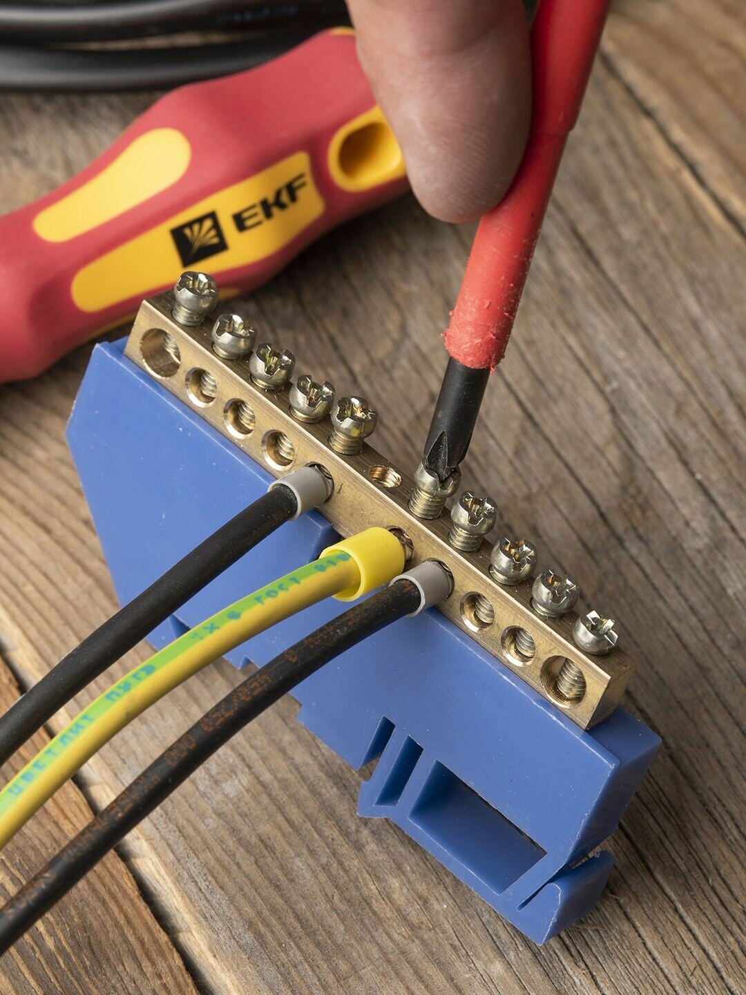 Шина нулевая N 6х9 10 отверстий синий изолятор на DIN-рейку латунь розн. стикер PROxima EKF sn0-63-10-d-r
