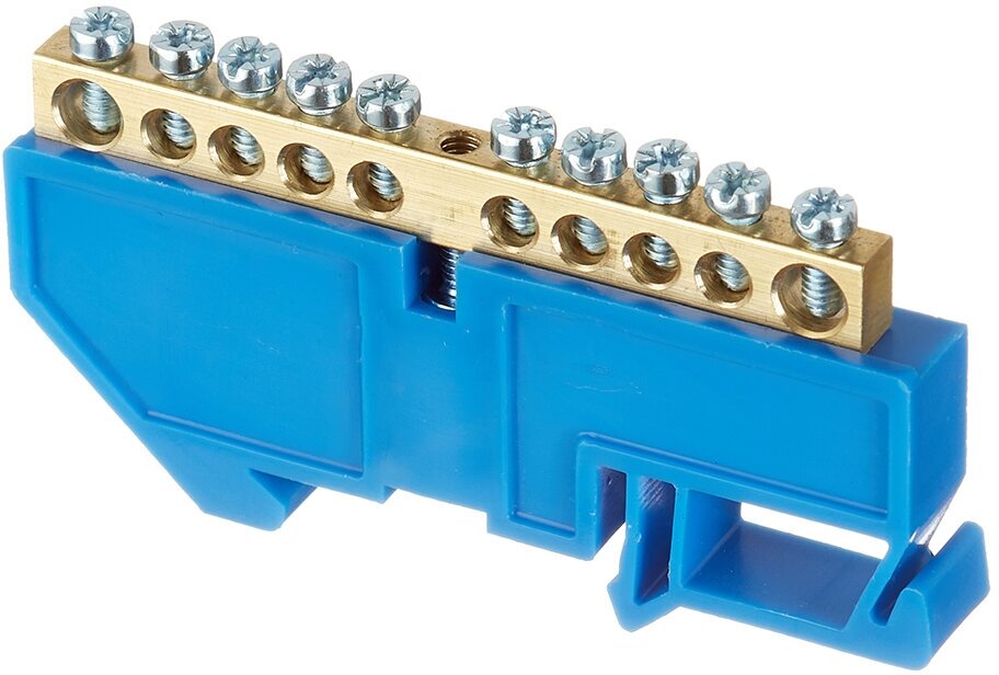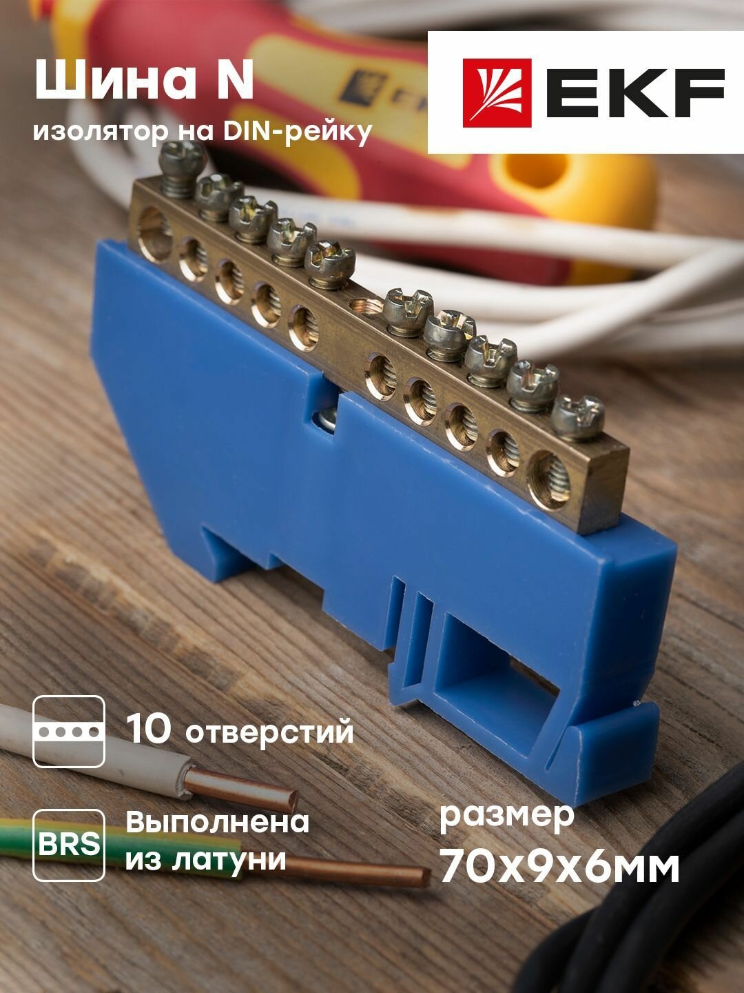 Купить Шина нулевая "0" N (6х9мм) 10 отверстий латунь синий изолятор на DIN-рейку розничный стикер EKF PROxima - 1 шт