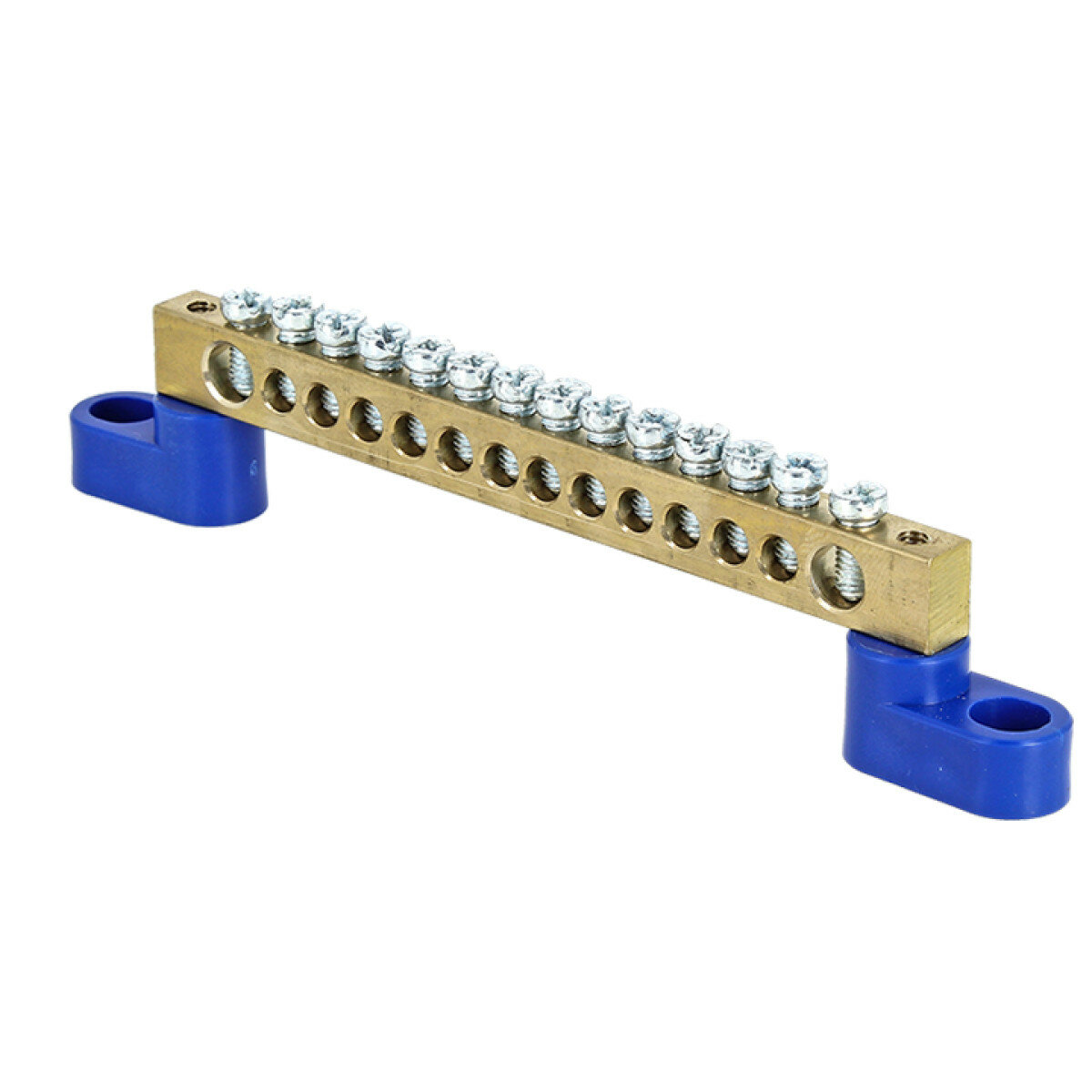 Купить Шина нулевая N 6х9 14 отверстий 2 синих угловых изолятора латунь розн. стикер PROxima EKF sn0-63-14-2-r