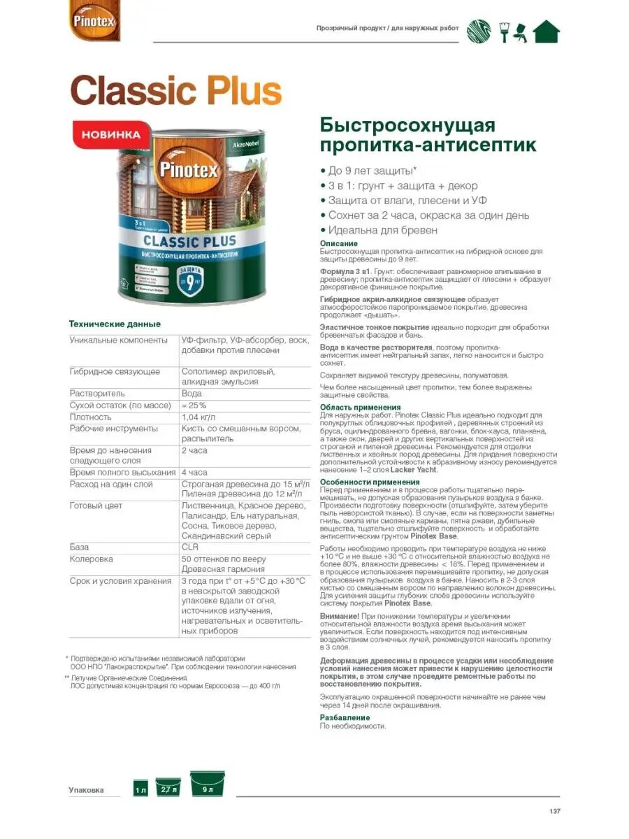 Ниже Вы можете прочитать отзывы на Пропитка-антисептик быстросохнущая для защиты древесины Pinotex Classic Plus, полуматовая (2,5л) лиственница, ознакомится с подробными характеристиками, посмотреть интересные обзоры и фотографии на Пропитка-антисептик быстросохнущая для защиты древесины Pinotex Classic Plus, полуматовая (2,5л) лиственница.