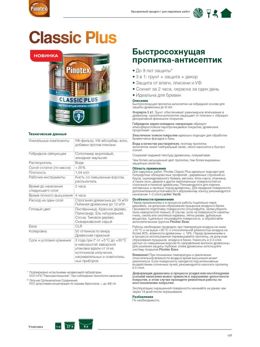 PINOTEX CLASSIC PLUS пропитка-антисептик быстросохнущая 3 в 1 лиственница 9л