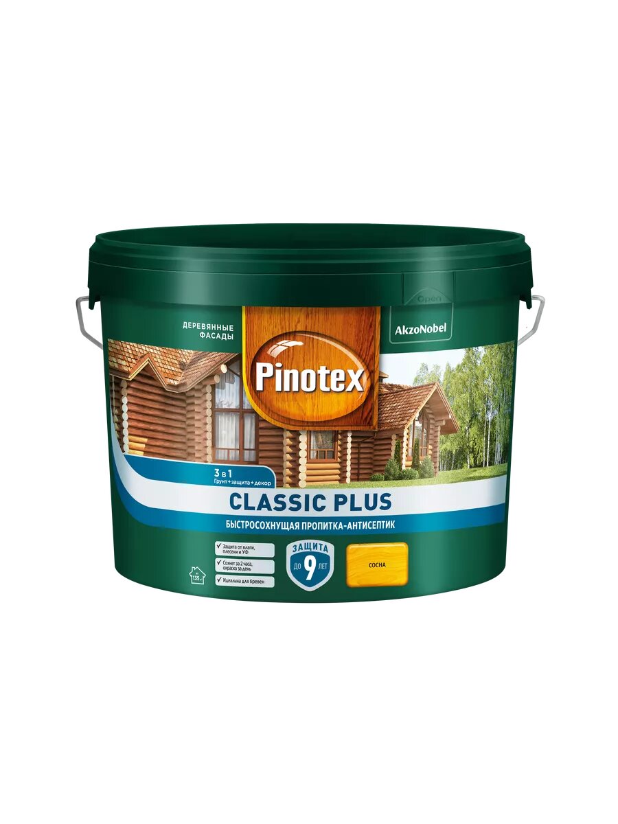PINOTEX CLASSIC PLUS пропитка-антисептик быстросохнущая 3 в 1 ель натуральная 9л
