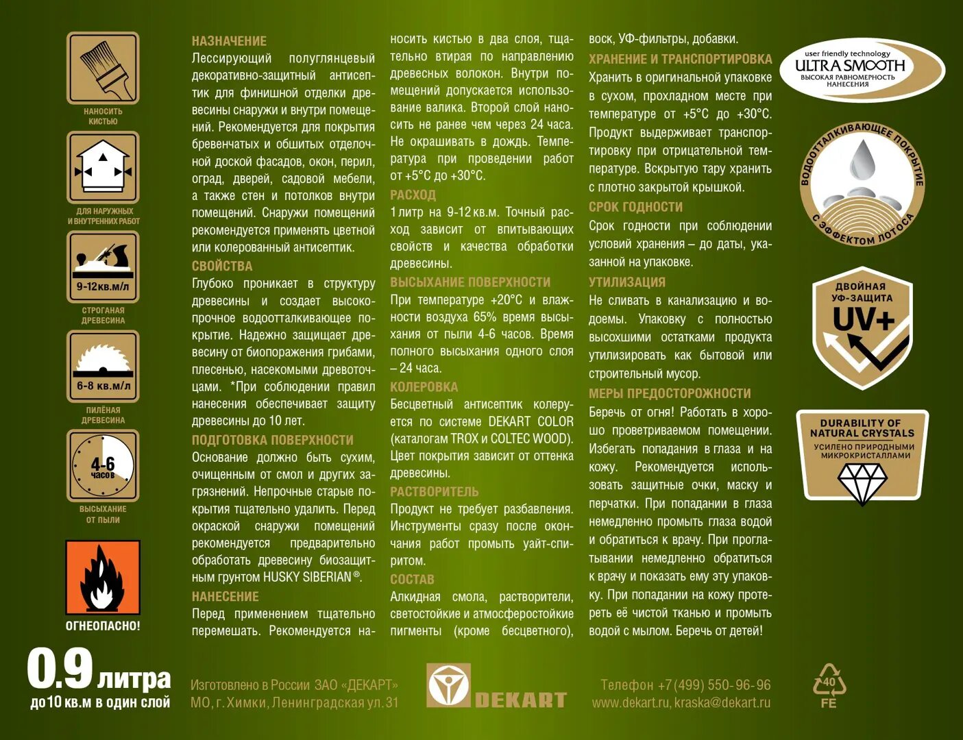 | Дополнительная информация | сделана на 100% акриловом связующем; наносится на поверхность строганой и пиленой древесины; сохраняет видимой текстуру и подчеркивает рисунок натуральной древесины; образует матовое или полуматовое покрытие (в зависимости от количества нанесенных слоев); обеспечивает защиту древесины до 7 лет. |