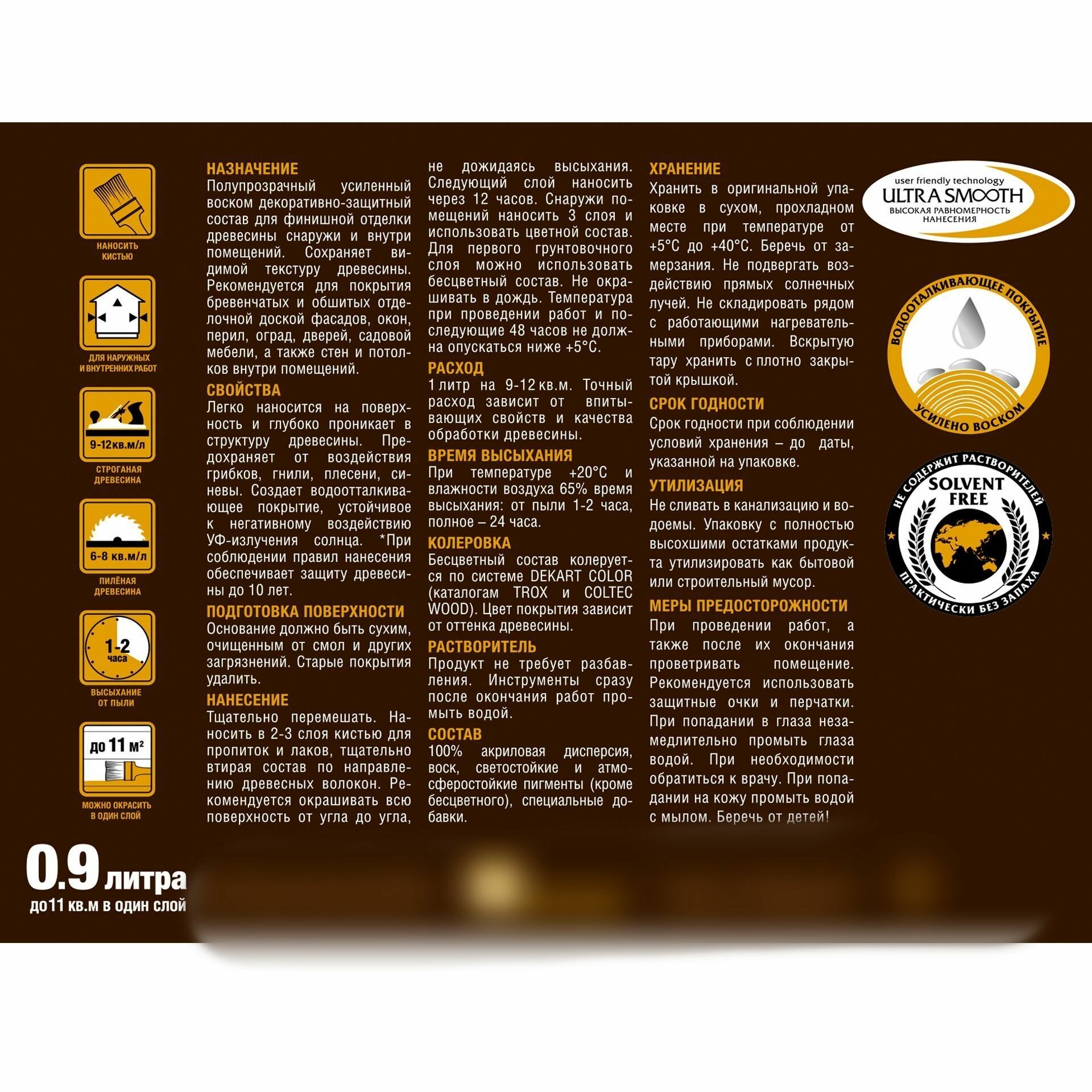 | Дополнительная информация | сделана на 100% акриловом связующем; наносится на поверхность строганой и пиленой древесины; сохраняет видимой текстуру и подчеркивает рисунок натуральной древесины; образует матовое или полуматовое покрытие (в зависимости от количества нанесенных слоев); обеспечивает защиту древесины до 7 лет. |