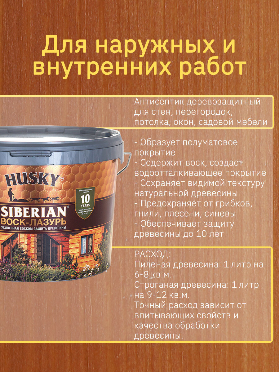 СохранитьХаски / Воск-лазурь для древесины, пропитка антисептик для дерева, декоративно-защитный состав HUSKY SIBERIAN орегон (2,5л) интересное: