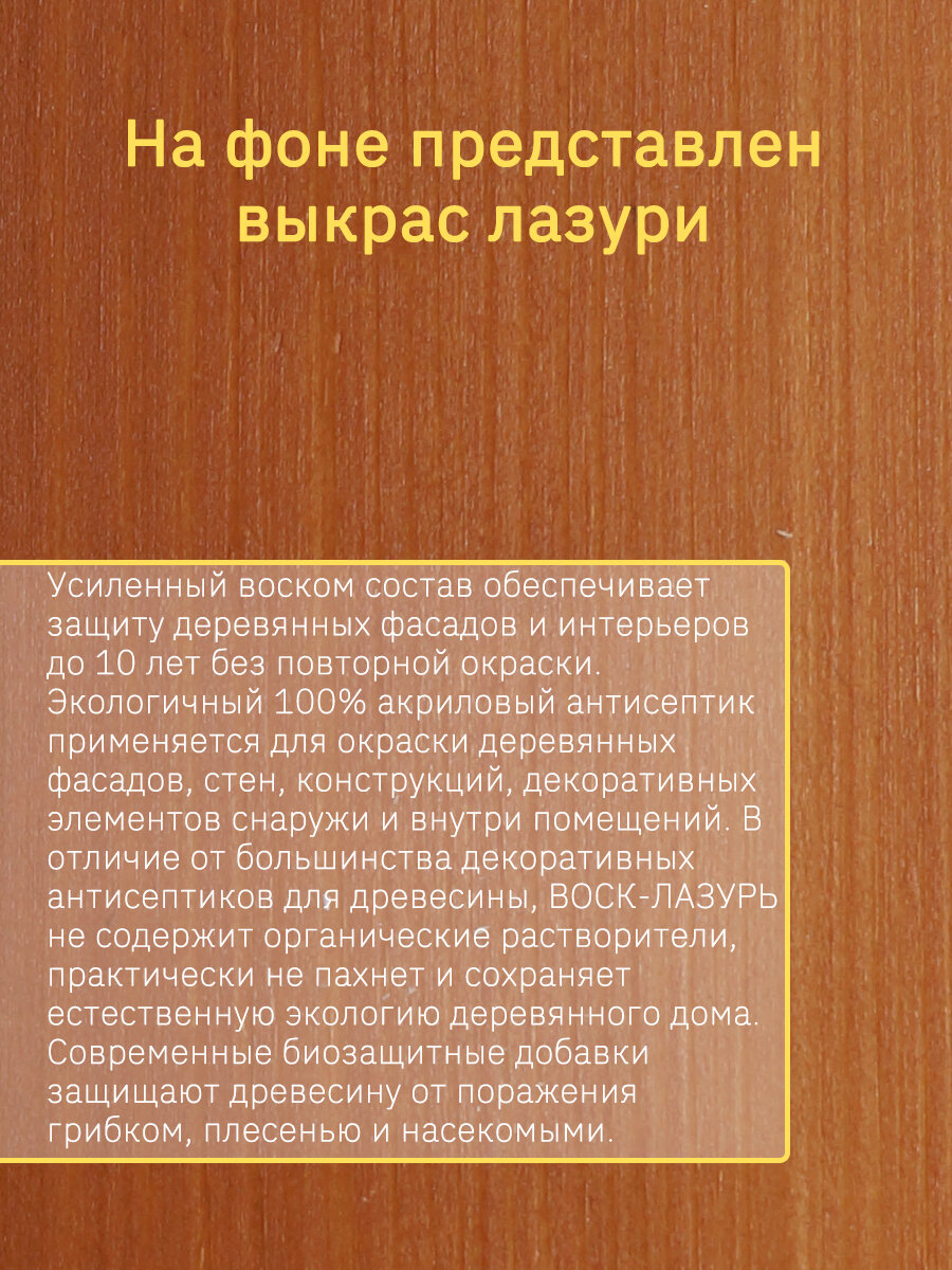 | Дополнительная информация | сделана на 100% акриловом связующем; наносится на поверхность строганой и пиленой древесины; сохраняет видимой текстуру и подчеркивает рисунок натуральной древесины; образует матовое или полуматовое покрытие (в зависимости от количества нанесенных слоев); обеспечивает защиту древесины до 7 лет. |