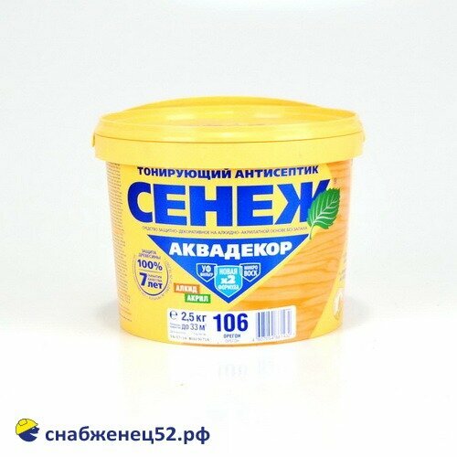 Сенеж аквадекор. Цвет 106 Орегон. Тонирующий антисептик на алкидно-акрилатной основе с УФ фильтром и воском для долговременной защиты и отделки древесины. Ведро массой нетто 2,5 кг.