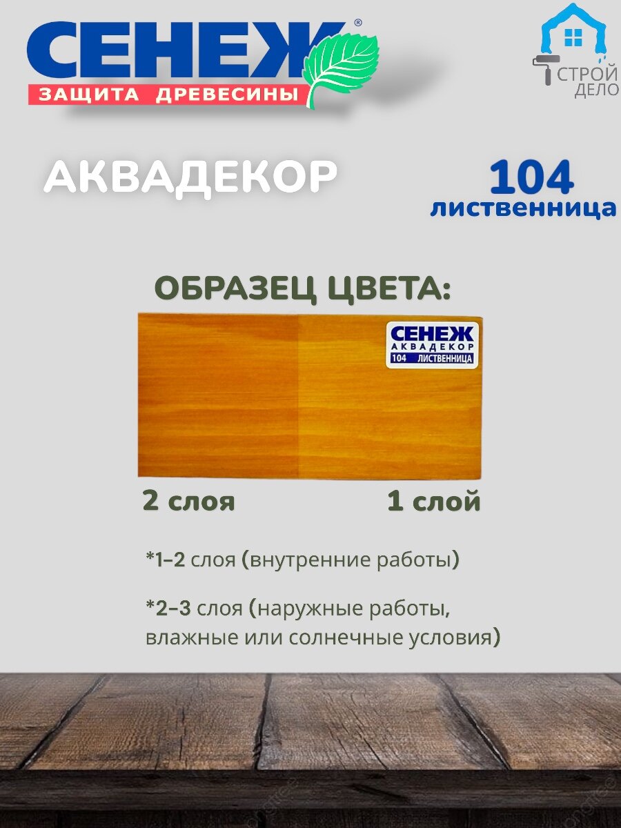 Сенеж аквадекор. Цвет 104 Лиственница. Тонирующий антисептик на алкидно-акрилатной основе с УФ фильтром и воском для долговременной защиты и отделки древесины. Ведро массой нетто 2,5 кг.