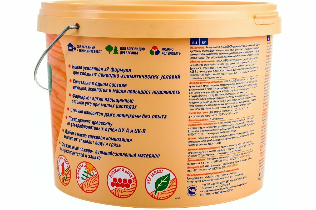 Сенеж аквадекор. Цвет 103 Сосна. Тонирующий антисептик на алкидно-акрилатной основе с УФ фильтром и воском для долговременной защиты и отделки древесины. Ведро массой нетто 2,5 кг.