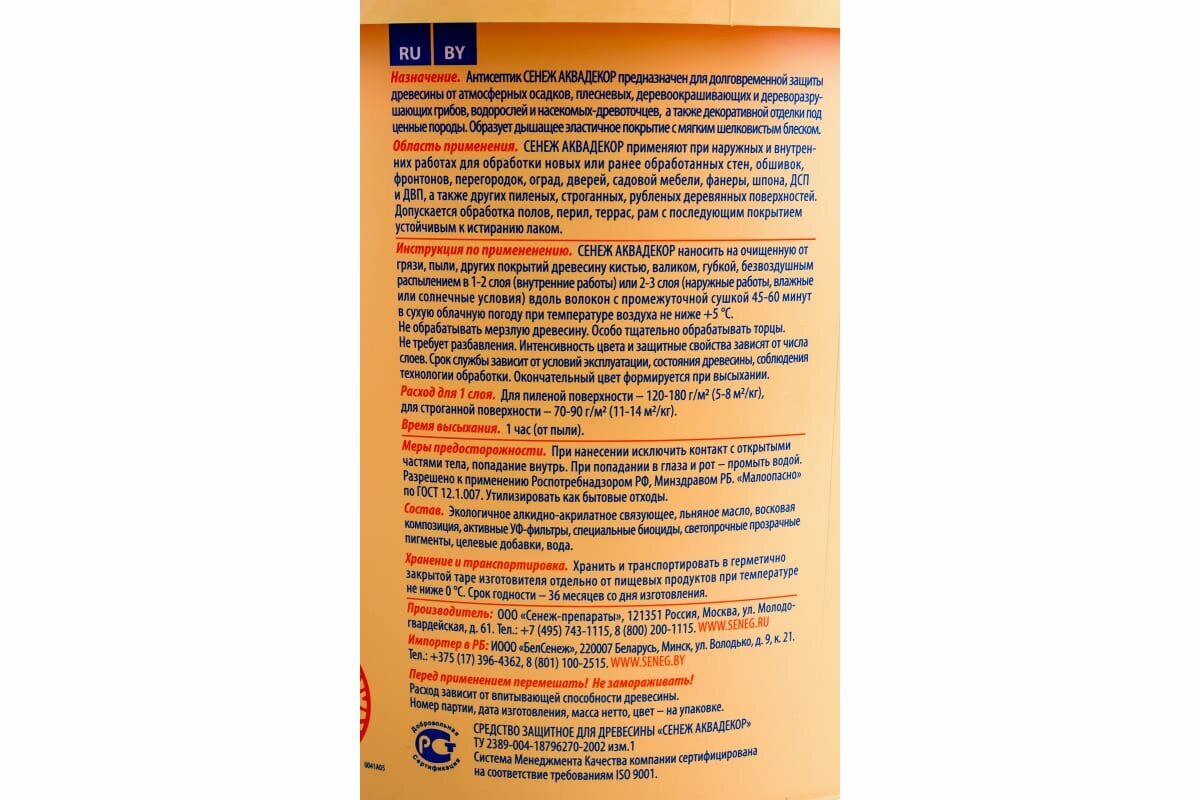 Сенеж аквадекор. Цвет 109 Орех. Тонирующий антисептик на алкидно-акрилатной основе с УФ фильтром и воском для долговременной защиты и отделки древесины. Ведро массой нетто 9 кг.