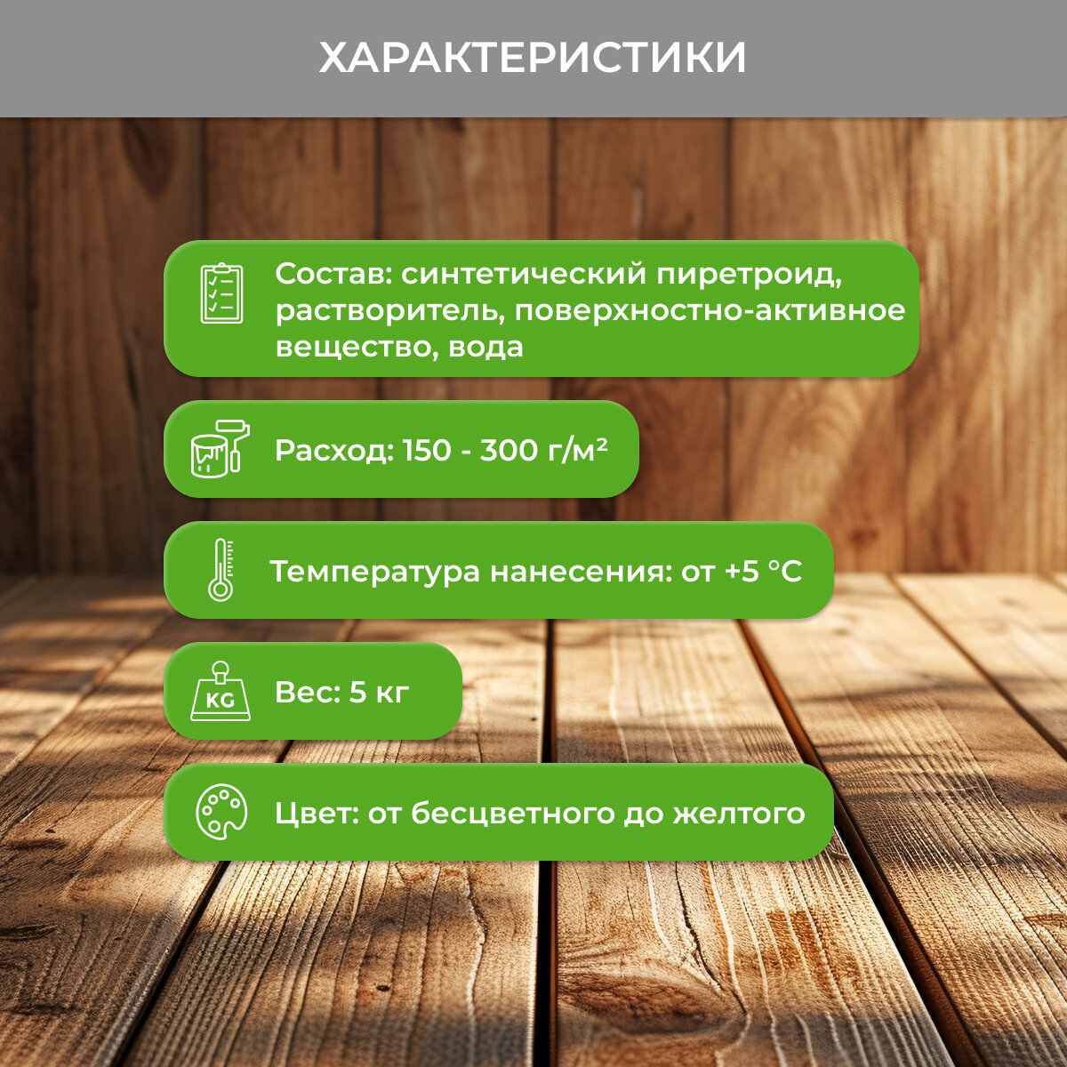 | Дополнительная информация | для профилактической защиты расход составляет 150-200 г/м2; 250-300 гр/м² — уничтожение насекомых; разводится водой в соотношении 1:4; хранить в проветриваемом помещении в плотно закрытой заводской таре, при температуре от +5°С до +30°С; 5 циклов замораживания-размораживания; избегать попадания солнечных лучей и нагрева; срок хранения готового раствора 3 дня; не допускать попадания препарата в водоемы, сточные воды, грунт; утилизация согласно СанПиН 2.1.7.1322-03, используется для обработки конструкций из древесины (брусья, стропила, полы и др.), для обработки лесо- и пиломатериалов |