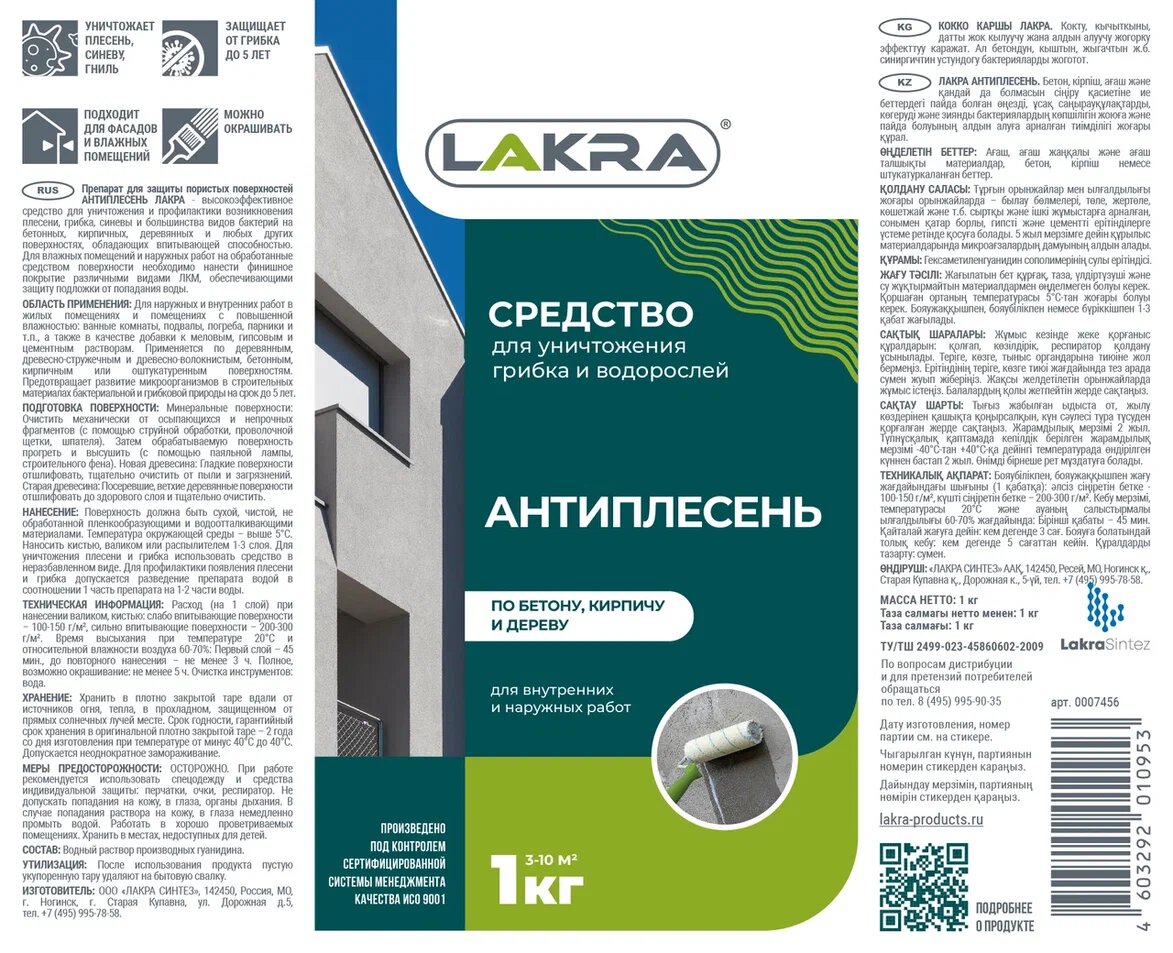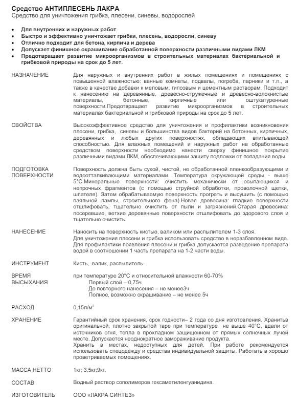 | Дополнительная информация | Антисептик лакра Антиплесень 1кг, арт. АНТИ-1 |