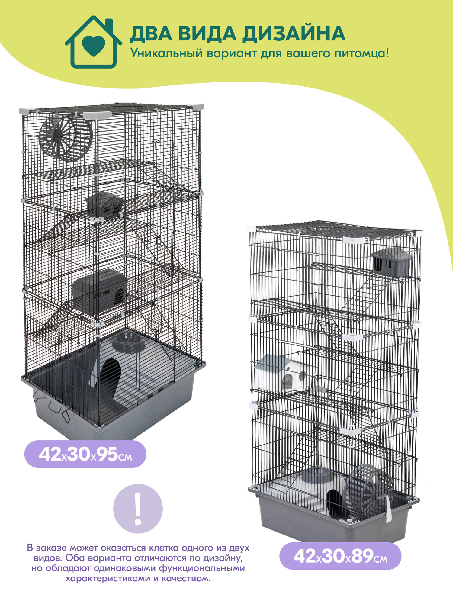 Купить Клетка для грызунов "PetTails" разборная, шаг прута 10,5мм, 42*30*h89см, 5 этажей (+полка-домик, колесо, миска, 2 пласт. домика) серая