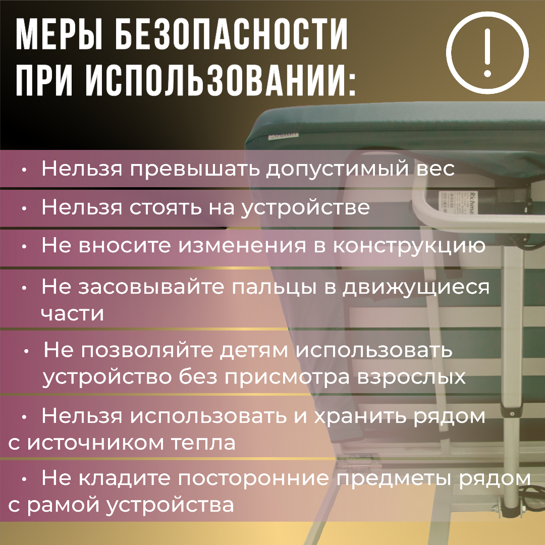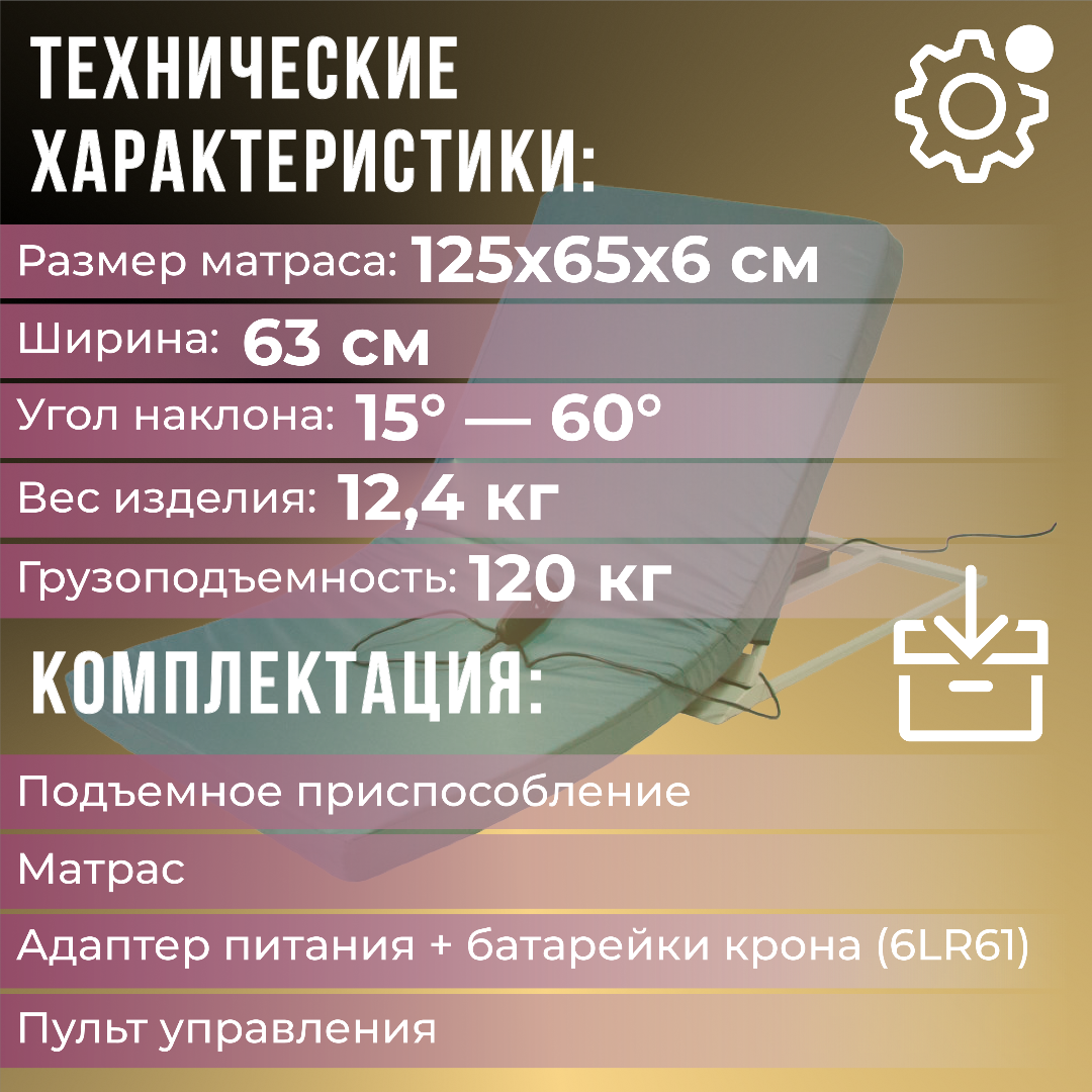 | Подробная комплектация | 1. Подъемное приспособление - 1 шт. 2. Адаптер питания – 1 шт. 3. Пульт управления – 1 шт. 4. Батарейка крона (6LR61) – 2 шт. 5. Матрас – 1 шт. 6. Паспорт - 1 шт. |