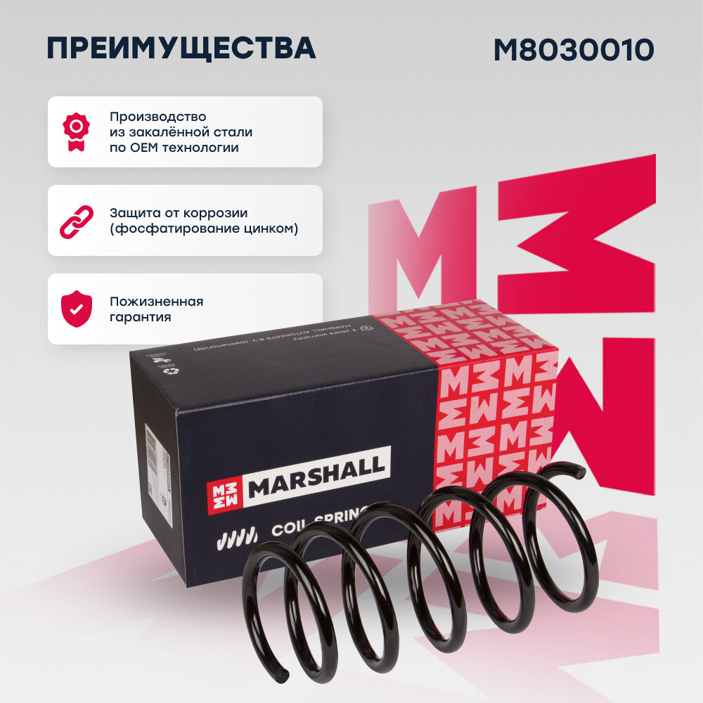 Пружина подвески передняя MARSHALL M8030010 для Renault Logan 04-, Lada Largus 12- // кросс-номер KYB RG3068; Lesjofors 4017000 // OEM 6001547496; 6001547706; 6001548549; 6001549183; 6001549184; 6001549185; 6001549186; 6001549187; 6001549188; 6001549189