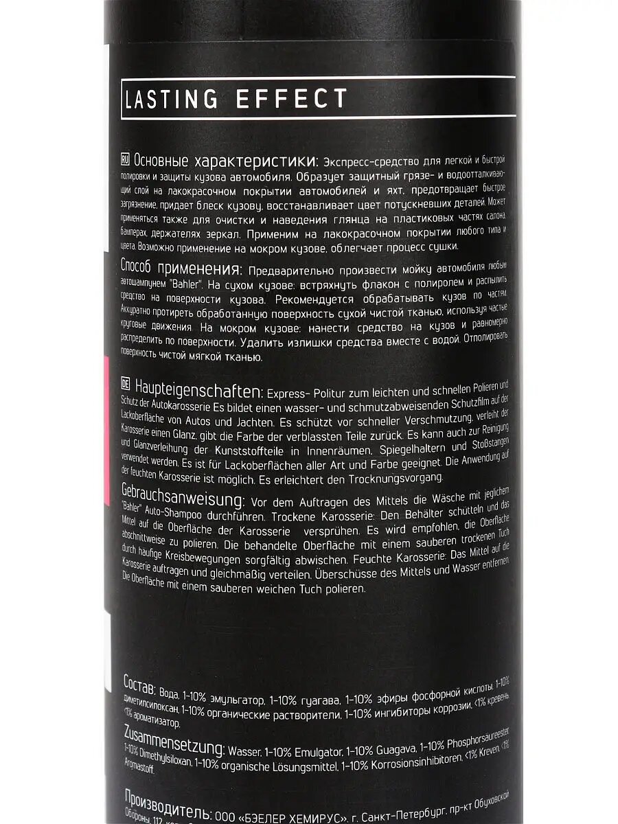 | Способ применения | На сухом кузове: встряхнуть флакон с полиролем и распылить средство на поверхности кузова. Рекомендуется обрабатывать кузов по частям. Аккуратно протереть обработанную поверхность сухой чистой тканью, используя частые круговые движения. На мокром кузове: нанести средство на кузов и равномерно распределить по поверхности. Удалить излишки средства вместе с водой. Отполировать поверхность чистой мягкой тканью. |