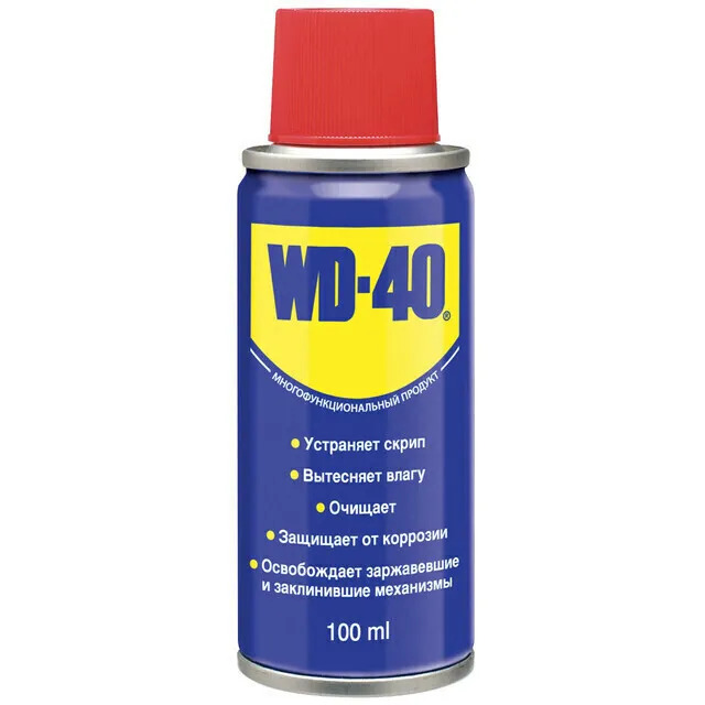 СохранитьСмазка Спрей WD-40 (100 мл) Благодаря своим проникающим и смазывающим свойствам WD-40 помогает деталям . Устраняет скрип, вытесняет влагу с металлических поверхностей, очищает от смолы, клея, жира. Оставляет защитную плёнку против коррозии. интересное: