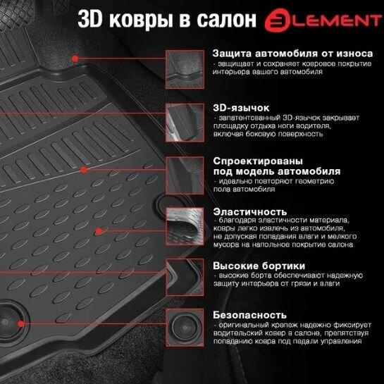 | Особенности | 3D-коврик / на клипсах / противоскользящее покрытие / с бортиками / с фиксаторами |