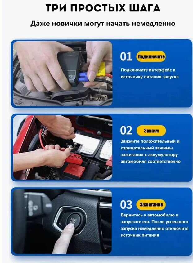 | Комплектация | Пусковое устройство, кейс для хранения, зажимы, кабель для зарядки устройств |