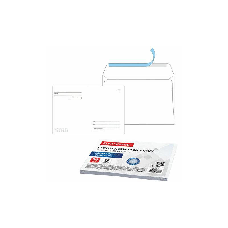 Конверт почтовый бумажный белый "С4" формата 229х324 мм с клеевым слоем, 90 г/м2, комплект/набор из 50 штук, Brauberg, внутренняя запечатка, 112178