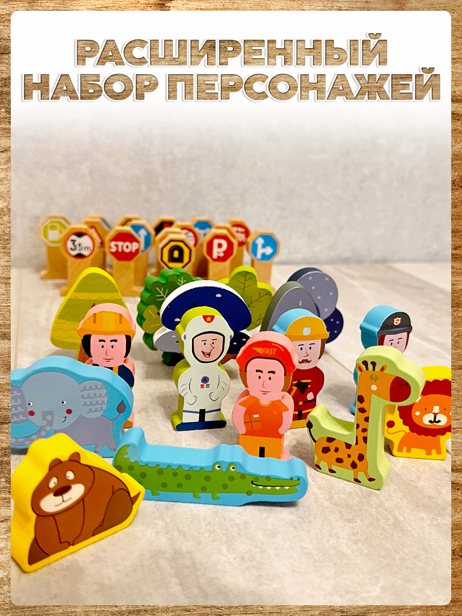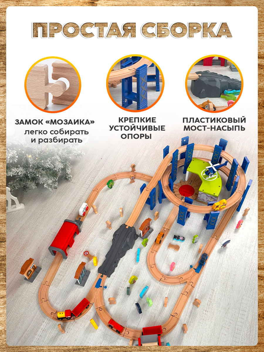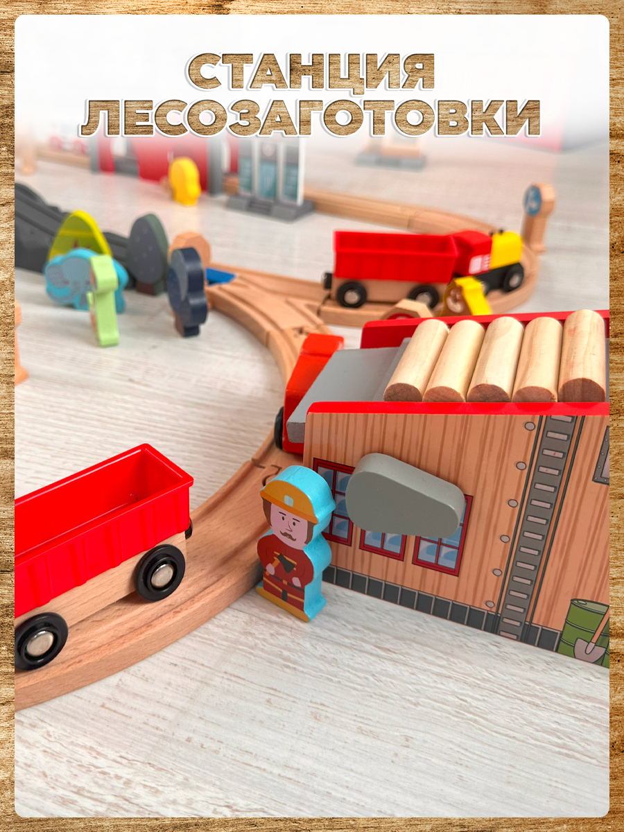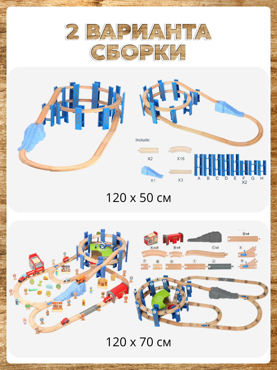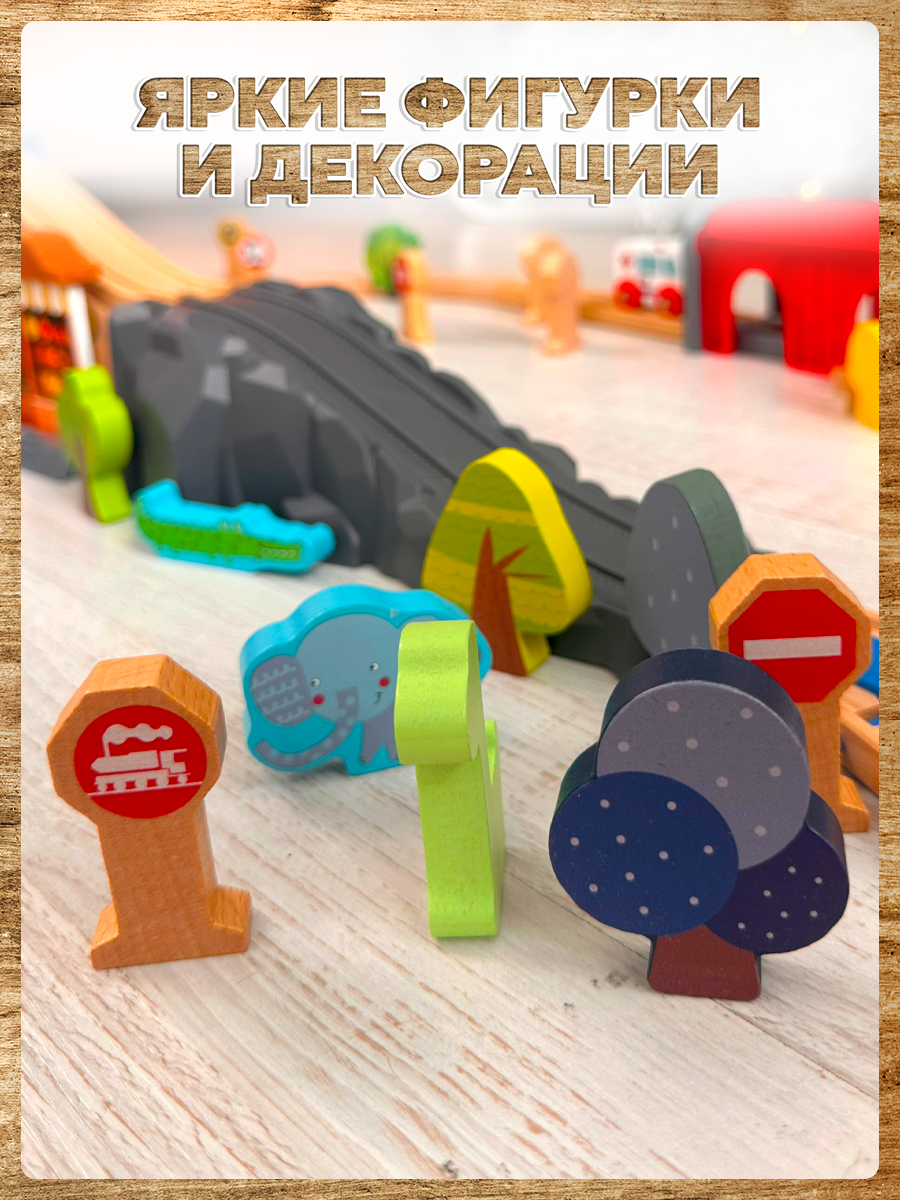 Деревянная железная дорога с фигурками животных и мостом 82 детали