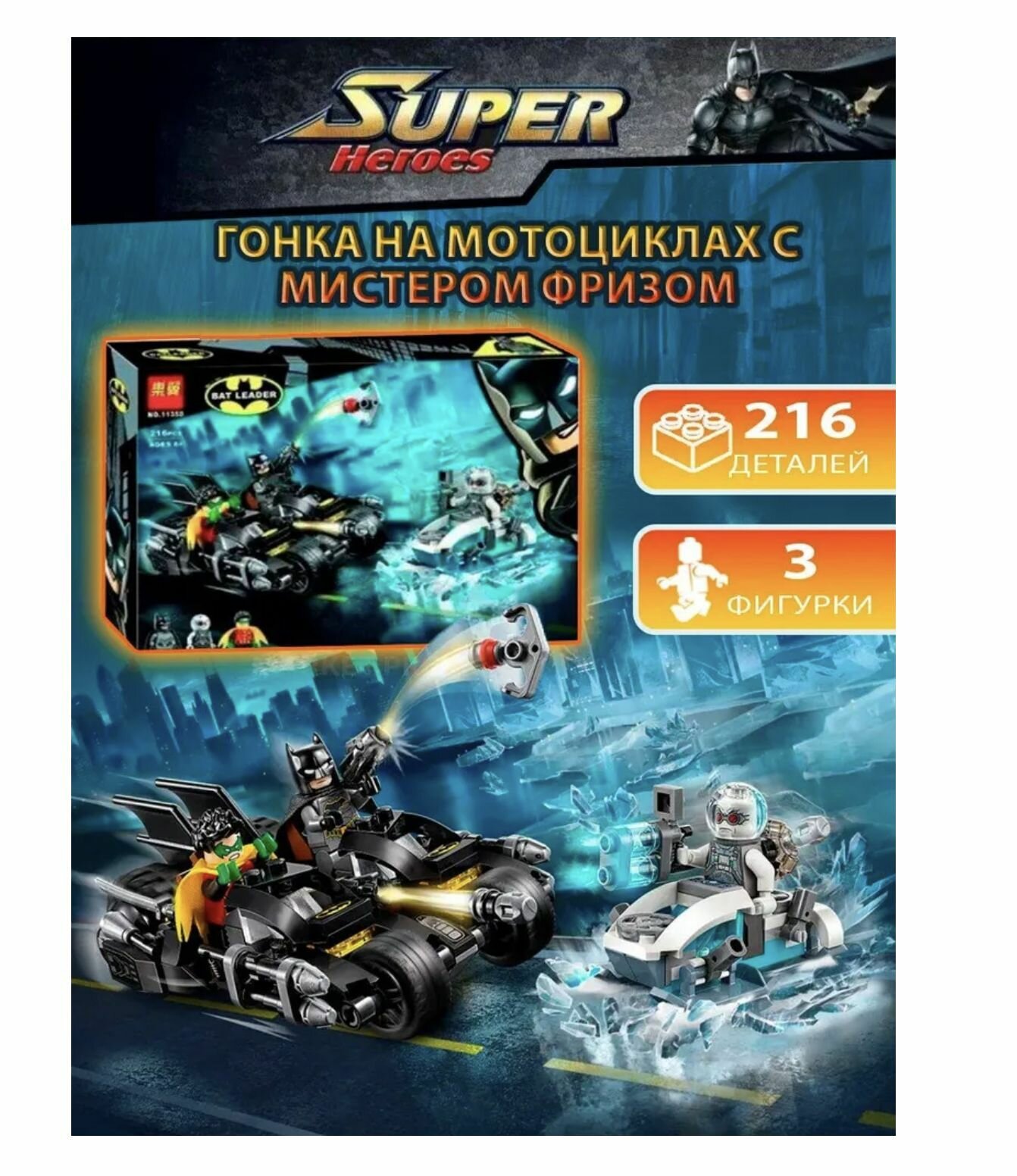 | Цвет товара | темно-серый, конструктор batleader batman "гонка на мотоциклах с мистером фризом" 216 деталей |